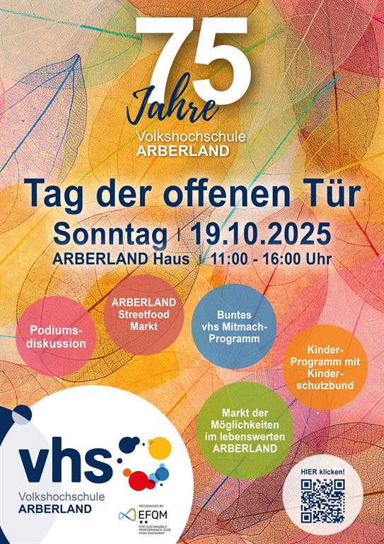 Unter dem Leitgedanken „Für mich, für dich, für alle“ lädt die vhs ARBERLAND zu einem besonderen Tag der offenen Tür ein. Die Veranstaltung bietet ein abwechslungsreiches Programm mit Informations- und Mitmachangeboten für alle Altersgruppen. Ziel ist es, die Vielfalt der vhs und ihrer Partner aufzuzeigen und Möglichkeiten zur Begegnung und zum Austausch zu schaffen.