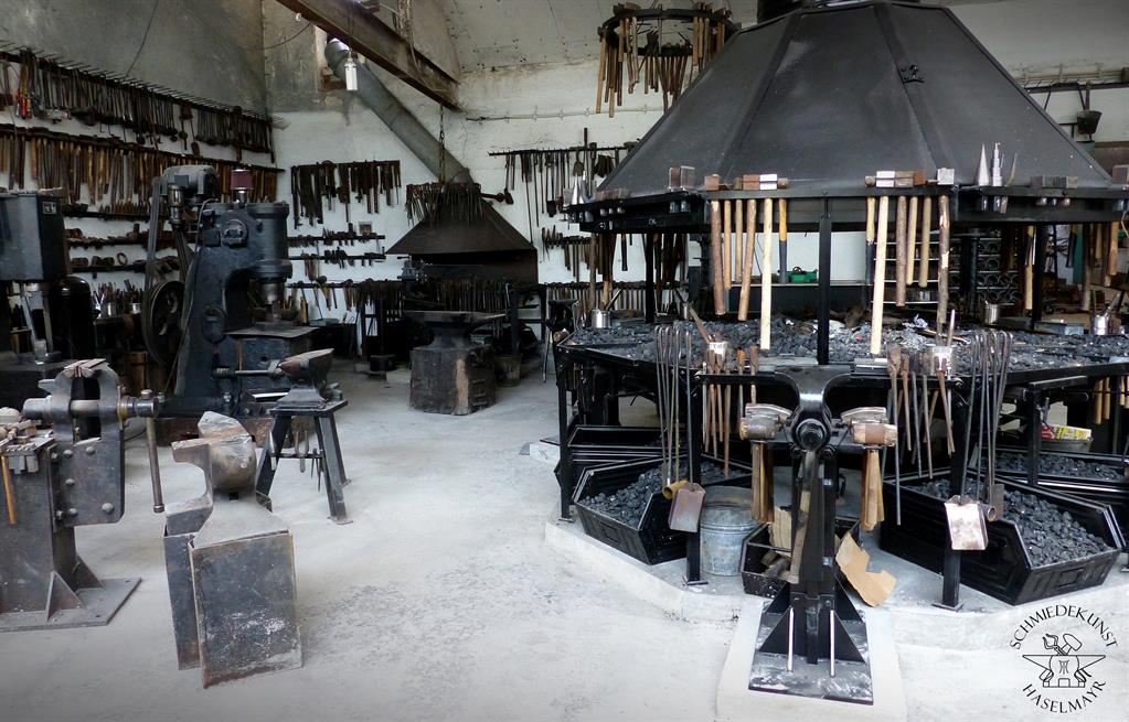 • In sehr gut ausgestatteter Schmiedewerkstatt mit 6 Maschinenhämmern, verschiedenen Ambossen, Kohlen- und Gasfeuern, 100-Tonnen-Presse, Spindelpressen und mehreren Schleifmöglichkeiten für Messer (10 Bandschleifer) etc.